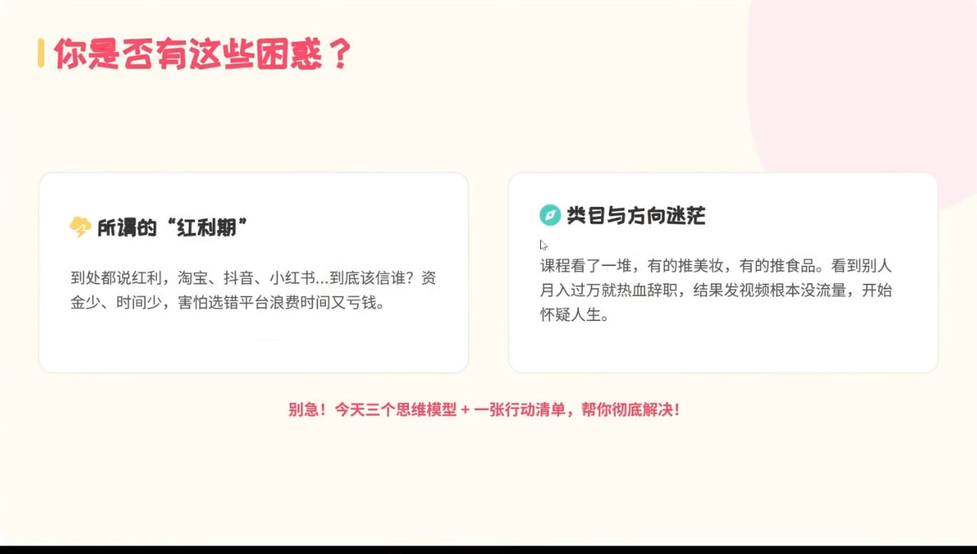 专为小红书电商新手、流量瓶颈从业者定制的实操课!8 节纯干货拆解电商全流程,从开店选品、爆款笔记打造,到冷启动实操、数据复盘,帮你 30 天快速上手,避开变现陷阱,吃透从 0 到 1 的流量逻辑与转化技巧,轻松突破增长瓶颈。